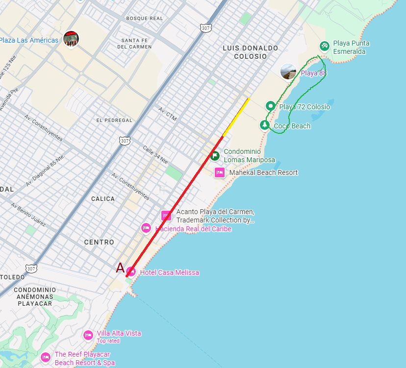 Совершенно случайно сняли AirBnB в правильном районе - рядом с пешеходной пятой авеню (на карте выделена красным), где жизнь на ней еще не замирает, но толпы реже и шума куда меньше, чем в центре. Если по ней пойти на север в сторону лучших в городе пляжей (обведены зеленым), метров через двести пройдешь последнее кафе, а дальше уже и впариватели не беспокоят (желтая линия).